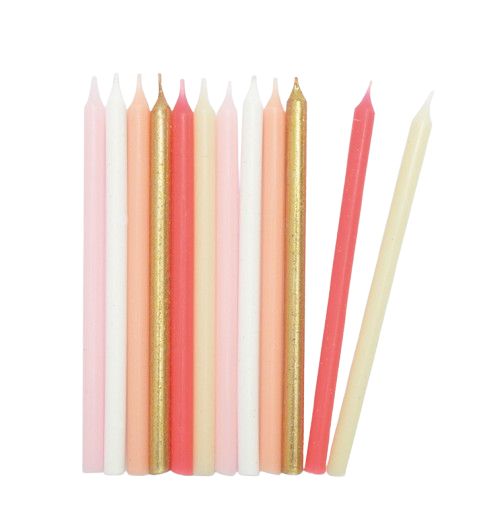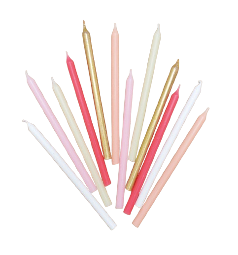 Un assortiment de 12 bougies en paraffine rose & or. De magnifiques décorations pour donner un style girly à un gâteau d’anniversaire, à vos cupcakes et autres pâtisseries.