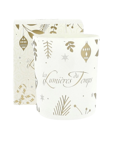 Bougie collection Noël « Marché de Noël ». Parfum Fleur de Givre. Pyramide olfactive : Pêche Blanche | Coton, Fleurs Blanches | Cèdre, Musc Blanc