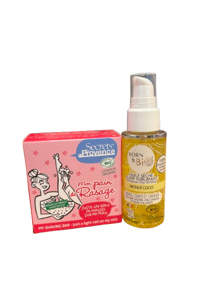 Ce duo sera idéal pour prendre soin de votre peau tout en respectant l’environnement. D’un côté, le Pain de Rasage pour Femme offre une alternative naturelle aux mousses et gels classiques, assurant un rasage tout en douceur grâce à sa formule riche en huiles végétales, beurre de karité bio et aloe vera bio. De l’autre, l’huile sèche élixir sublimant au monoï et à la noix de coco certifiée bio enveloppe la peau d’un voile nourrissant et soyeux, prolongeant l’effet de douceur tout en laissant un parfum délicat et envoûtant. Une combinaison parfaite pour une peau douce, hydratée et éclatante !