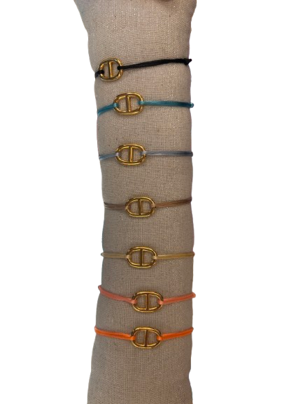 Bracelets ajustables grâce aux nœuds coulissants, montés sur fil de polyester brillant satiné.