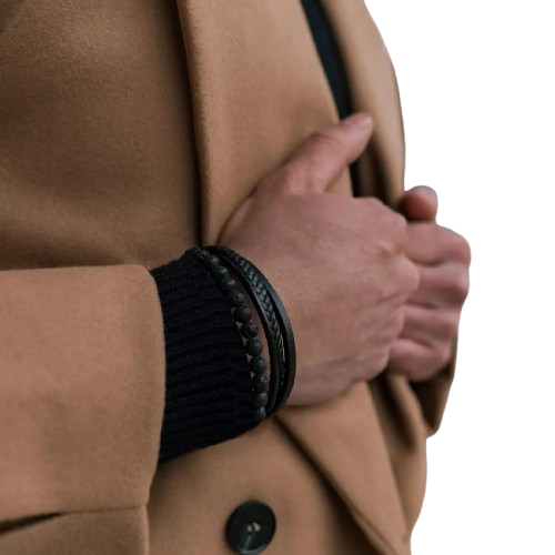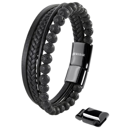 Conçu pour s’adapter à toutes les situations – qu’il s’agisse d’une sortie entre amis, d’un rendez-vous ou d’un moment spécial – ce bracelet associe le cuir tressé, les perles de pierre de lave naturelle et l’acier inoxydable poli pour un rendu sobre et élégant.