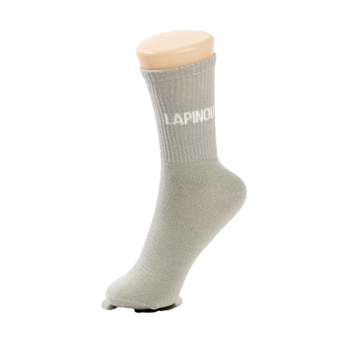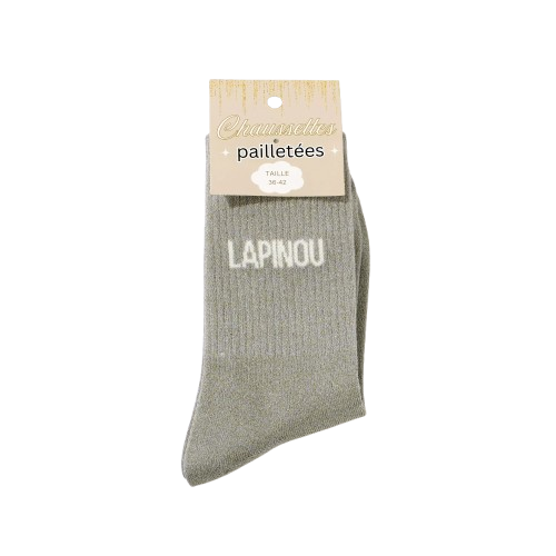 Dans un gris élégant, rehaussé de fils métalliques scintillants, ces chaussettes se portent aussi bien au quotidien que lors de moments cocooning. Le message "LAPINOU", inscrit avec douceur, évoque un surnom affectueux, une personnalité douce ou un lien complice avec quelqu’un de spécial.