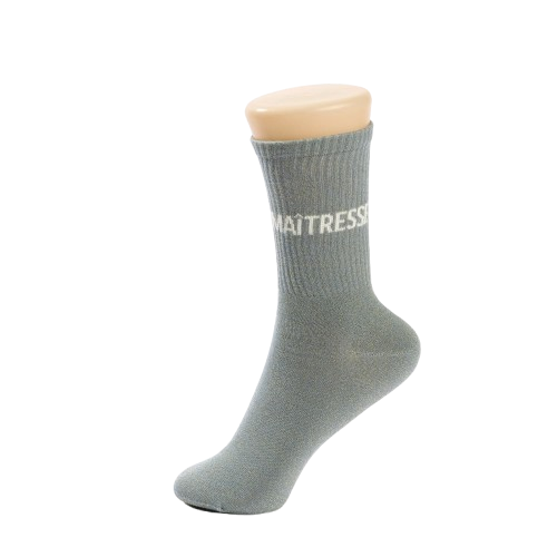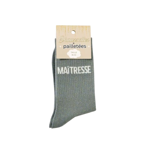 Parce qu’être maîtresse, c’est bien plus qu’un métier : c’est une vocation, une passion… et un super pouvoir ! Ces chaussettes à paillettes MAÎTRESSE rendent hommage à toutes celles qui transmettent, inspirent et gèrent une classe avec brio. Avec leur jolie teinte grise et leurs reflets pailletés subtils, elles ajoutent une touche élégante et lumineuse à votre quotidien. Le message "MAÎTRESSE", brodé avec fierté, envoie un clin d’œil complice à toutes celles qui tiennent la craie comme une baguette magique.Plus que 2 en stock