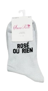 Apportez une touche de bonne humeur et de fraîcheur à votre tenue avec ces chaussettes à message ornées de fils argentés scintillants. Confortables et tendance, elles affichent fièrement “ROSÉ OU RIEN” pour un look fun et ensoleillé.