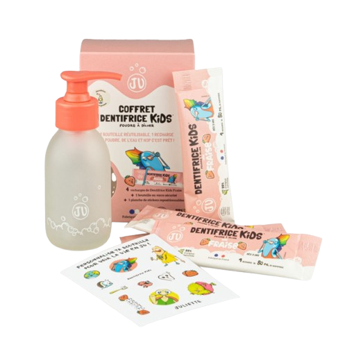 1 bouteille réutilisable en verre sécurisé + 4 eco-recharges en papier recyclable de 80 ml de dentifrice (tube classique de dentifrice enfant = 50 ml). En plus, grâce à sa pompe, fini le gaspillage de dentifrice qui tombe dans le lavabo : la pompe délivre la juste dose.