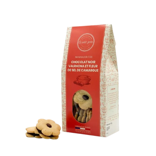 Les Marguerites Le Petit Zeste au chocolat noir Valrhona 61 % sont de jolis biscuits artisanaux aussi beaux que bons. Elles associent un sablé beurré délicatement croustillant à la puissance aromatique d’un chocolat noir d’exception, issu du savoir-faire français Valrhona, référence des maîtres chocolatiers depuis 1922. Chaque bouchée révèle des notes profondes de cacao, équilibrées par la douceur du beurre.