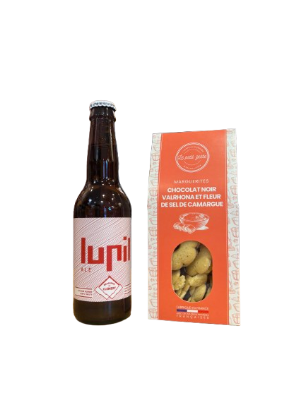 Ce coffret gourmand associe une bière artisanale française rafraîchissante et élégante à de délicats biscuits au chocolat noir Valrhona, pour un moment de dégustation.