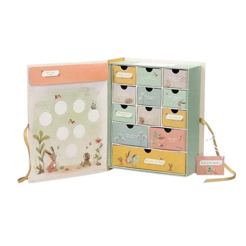 Coffret à trésors pour conserver les souvenirs de bébé dans chacun des tiroirs … Se referme avec de jolis liens et reprend les tendres illustrations des personnages de la collection Trois Petits lapins à l’intérieur comme à l’extérieur.