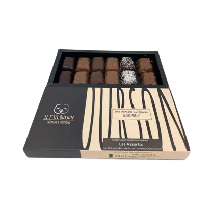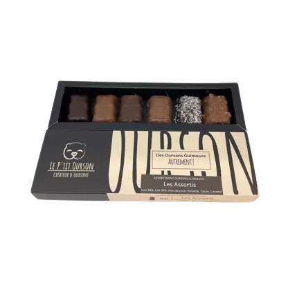 Découvrez le coffret oursons guimauve « Les Assortis », un assortiment gourmand de chocolats artisanaux à offrir ou à savourer. Chaque ourson révèle une saveur unique pour une pause douceur pleine de plaisir.