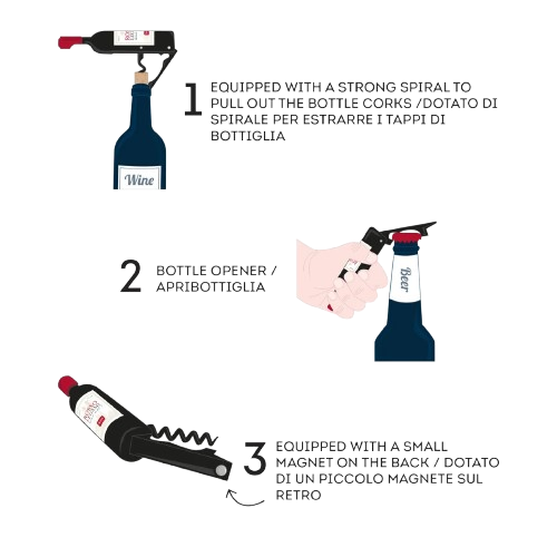 Conçu en forme de mini bouteille de vin, cet accessoire malin réunit un couteau de sommelier et un décapsuleur, parfait pour toutes les occasions. Grâce à son dos magnétique, il s’attache facilement à la porte du réfrigérateur, toujours à portée de main quand vient l’heure de l’apéro. Parce que… pourquoi pas un verre ?