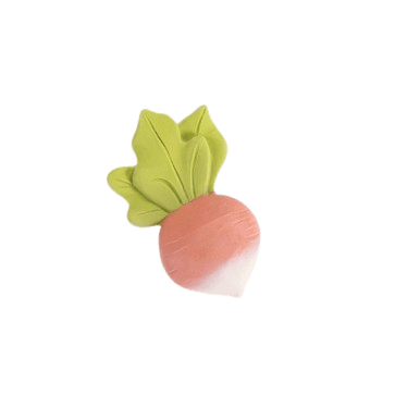 Hochet caoutchouc 100% naturel, issu de la sève d'Hévéa, en forme de croquant petit radis à machouillet et/ou à secouer. Facile à attraper par les petits mains, il éveillera les sens de bébé et apaisera ses gencives lors des poussées dentaires.