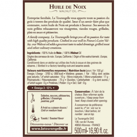 Produite à Saumur au coeur de la Vallée de la Loire, notre huile vierge de Noix est obtenue par simple pression des meilleures noix. Son savoureux parfum accompagnera idéalement vos vinaigrettes, viandes rouges, grillades et pâtisseries.