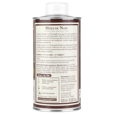 L’Huile de Noix de La Tourangelle est à la fois savoureuse et facile à cuisiner. Convaincus que les méthodes traditionnelles restent le meilleur moyen de préserver toutes les saveurs et les bienfaits du fruit, nous élaborons cette huile dans notre huilerie de Saumur. Notre Huile de Noix se caractérise par une délicate couleur ambrée, un goût de noisette à la fois riche et subtil. Allié secret des grands chefs depuis des années, nous partageons désormais avec vous cette délicieuse huile ! Essayez l’Huile de Noix de La Tourangelle et vous aurez envie d’y revenir encore et encore, de redécouvrir sans fin ce trésor.Recettes salées :