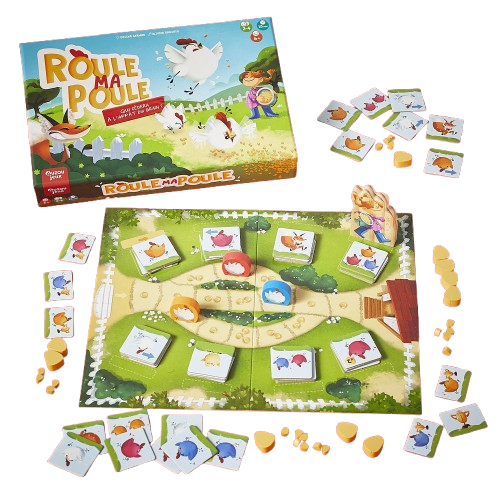 Plongez dans l’univers amusant du jeu Roule ma poule, où stratégie et chance rythment chaque partie. Les poules refusent de rentrer au poulailler, et la fermière doit agir vite. Ainsi, chaque joueur tente de faire avancer ses poules tout en pariant intelligemment pour récolter un maximum de grains de maïs.