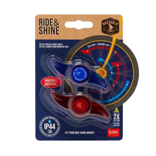 Avec le Set de 2 Lampes pour Rayons de Vélo de Legami, chaque tour de roue est un coup d’éclat ! Que vous choisissiez le thème Licorne ou Espace, ces lampes illumineront vos trajets avec style. Grâce aux clips, elles s’adaptent parfaitement aux rayons de votre vélo et peuvent être mises en place ou retirées facilement et en un éclair. Prêt à créer des jeux de lumière à chaque coup de pédale.