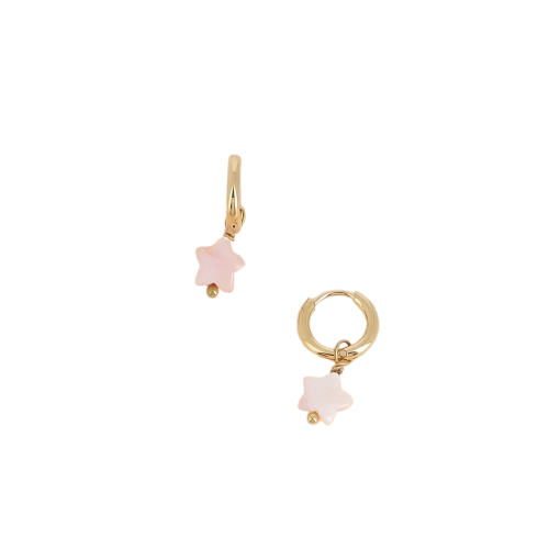 Boucles d’oreilles type créoles avec fermoir à charnière en acier inoxydable composées d’un pendentif en forme d’étoile nacrée.