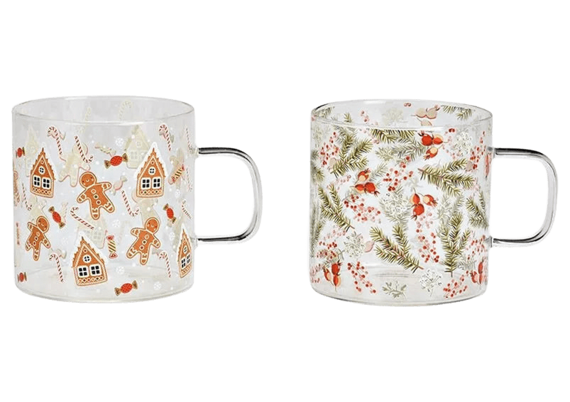 Mug avec décor de Noël en verre transparent motif pain d’épices ou houx (L/H/P) 13x9x9cm 450ml