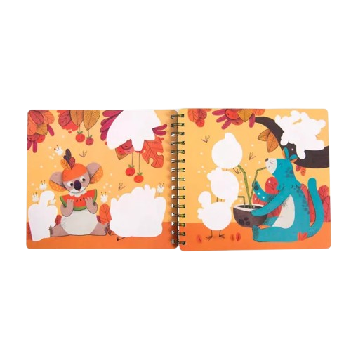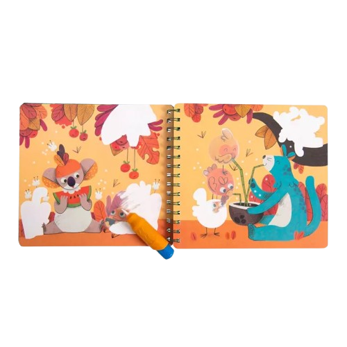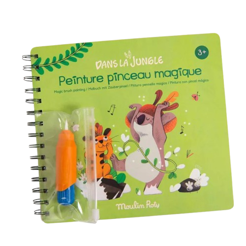 Avec ce pinceau magique, les enfants peuvent colorier les zones blanches des pages pour faire apparaître des illustrations exotiques de la jungle. Réutilisable, l'illustration disparaît une fois sèche.