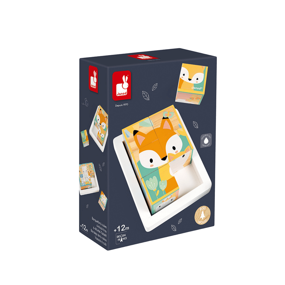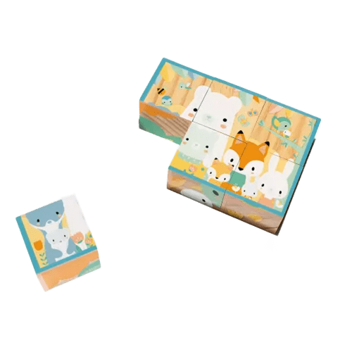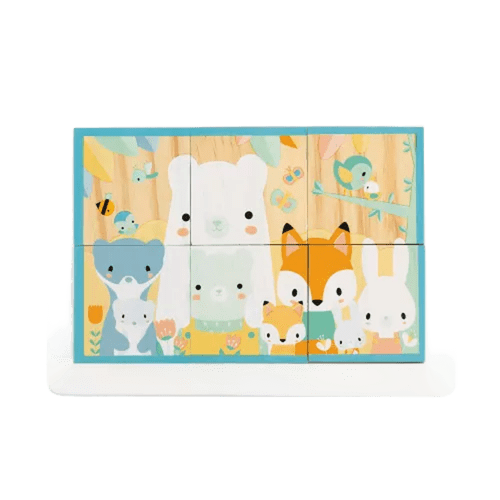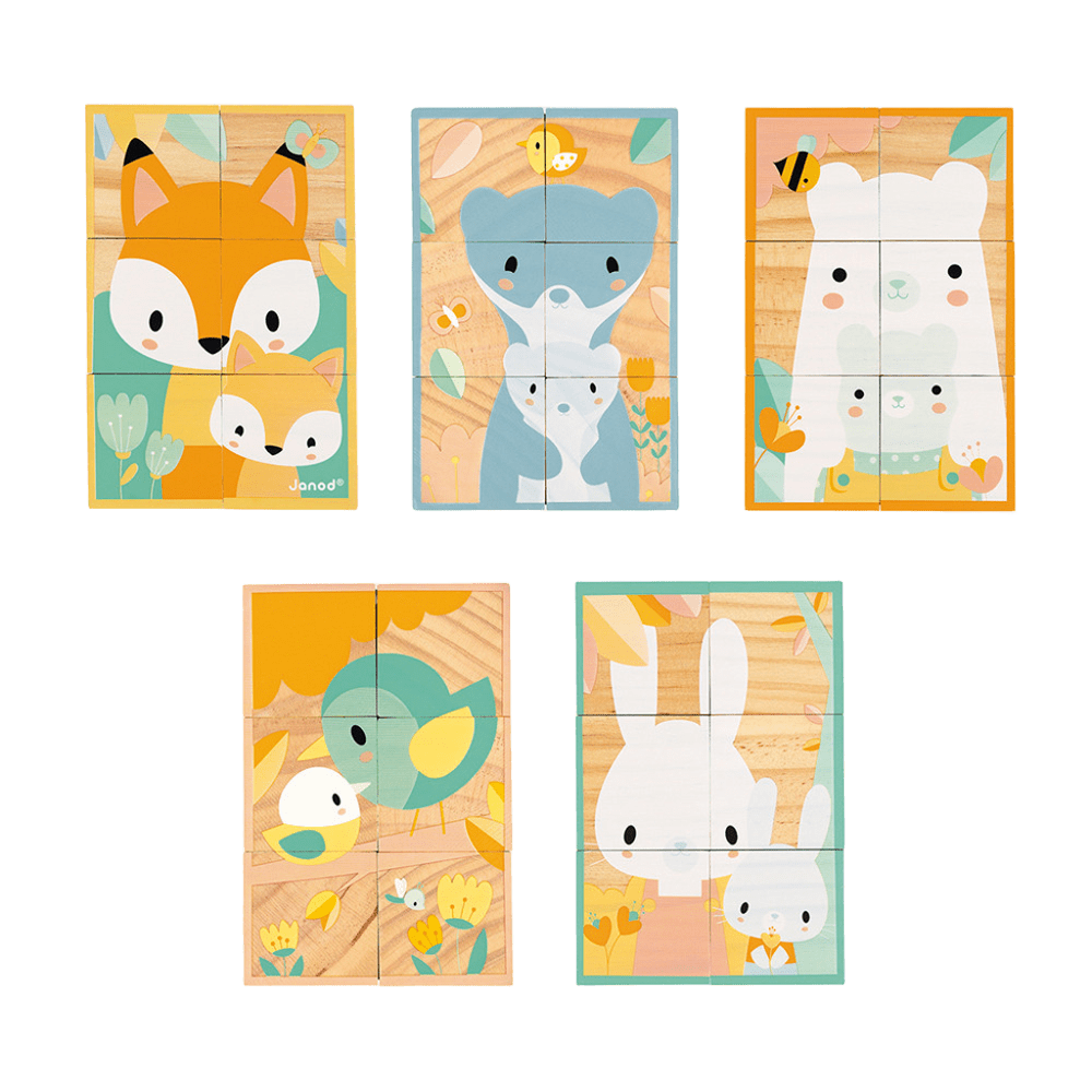 6 portraits d'animaux à recomposer Des cubes en bois massif Adapté aux tout-petits dès 1 an Manipuler & manier Toucher voir & entendre 1 - 3 ans Peinture à l'eau