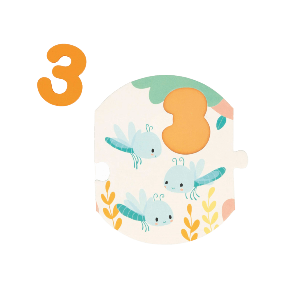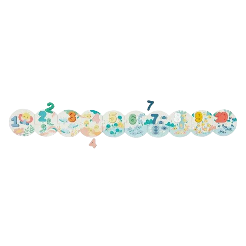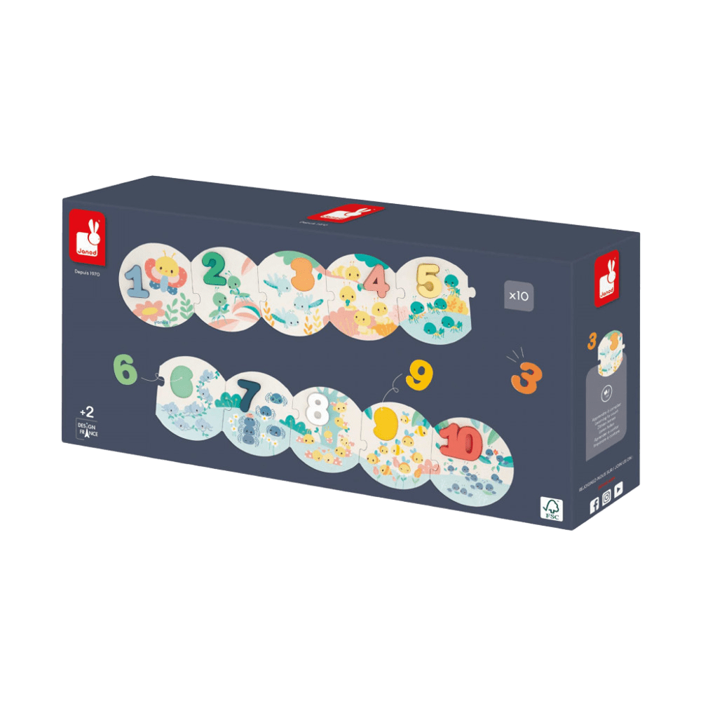 Apprentissage des chiffres en douceur avec ce magnifique puzzle en carton avec encastrement de chiffres colorés en bois ! Les animaux sont de la partie pour aider les petits à partir de 2 ans à compter jusqu’à 10, c’est encore plus amusant ! Une fois ce joli puzzle de 10 pièces aux couleurs pastel reconstitué, il faudra replacer le bon chiffre sur son emplacement. Il y a bien sûr l’ordre chronologique mais les enfants pourront également compter sur l’aide des animaux de chaque pièce ! 3 libellules, 8 coccinelles … et le compte est bon ! Un modèle est fourni pour aider les plus petits dans les premiers temps de jeu. Ce puzzle d’apprentissage est également idéal pour développer la motricité fine. Une fois reconstitué, il mesure plus d’un mètre de long ! Pratique, un pochon en coton permet de ranger les chiffres une fois le jeu terminé. Jouet d’éveil en bois et en carton FSC®. Infos produit Dimensions 109,7 x 13,2 x 1,2 cm Matière Bois, carton Type de packaging Jolie boite fermée