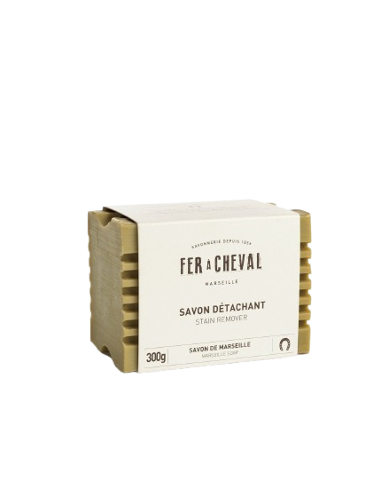 Ce savon détachant 300  grs est fabriqué au Savon de Marseille Fer à Cheval reconnu pour son efficacité détachante légendaire. Il a été spécialement conçu en format stick pour une application précise et efficace sur les taches rebelles. Pratique par sa taille, il se range facilement dans un tiroir de cuisine ou d’atelier, se glisse dans une valise, toujours prêt à l’usage ! Une saponification à l’ancienne en chaudrons Près de 10 jours sont nécessaires pour l’élaboration de notre savon détachant 300 grs cuit en chaudrons selon le procédé marseillais. Ce savoir-faire et cette fabrication traditionnels, précieusement transmis de génération en génération de Maîtres savonniers, est toujours à l’honneur dans notre savonnerie. Un savon naturel et hypoallergénique Formulé à base d’huiles exclusivement végétales, sans ajout de conservateur, colorant, parfum ou graisses animales, ce savon est adapté aux peaux sensibles et délicates.  Facilement biodégradable et non polluant, il est doux pour l’environnement Il constitue une alternative écologique aux produits chimiques d’entretien. Exigez le logo d’authenticité  Le Fer à Cheval est membre fondateur de l’UPSM, l’Union des Professionnels du Savon de Marseille, qui œuvre pour la certification du véritable savon de Marseille. Ce logo vous garantit : • Composition à base d’huiles exclusivement végétales, sans additif chimique, conservateur ou parfum • Fabrication en chaudrons selon le procédé marseillais comprenant 5 étapes • Origine géographique de la région marseillaise MADE IN FRANCE