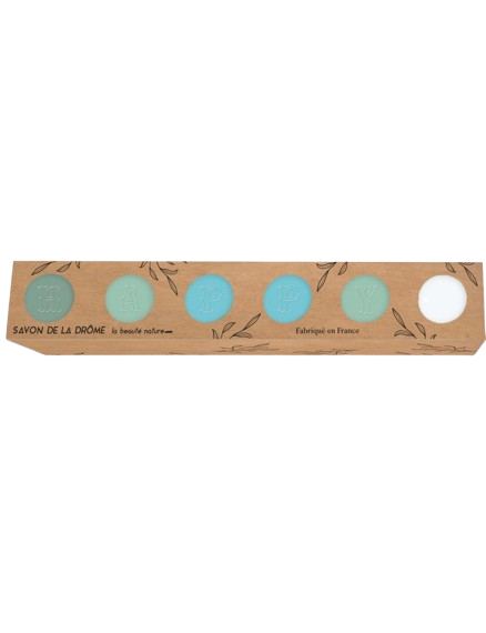 Savons colorés fantaisies en Cubes avec l'inscription "HAPPY" (6 cubes de savon dans une boite kraft)