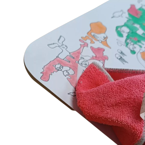 Fabriqué dans un matériau souple, durable et normé EN71 (sécurité des jouets), ce set de table se roule facilement pour être transporté partout sans risque de l’abîmer. Utilisable avec des feutres à l’eau ultra-lavables ou des craies grasses, il se nettoie en un clin d’œil avec une lingette microfibre, une éponge ou un linge humide. Il suffit ensuite de sécher la surface avec un chiffon sec, et le tour est joué !