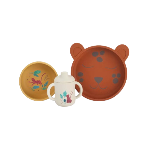 Mangez en compagnie de Taïgo au cœur de la forêt ! Coffret vaisselle en silicone, tendrement illustré pour manger comme les grands. Comprend un bol, une tasse d'apprentissage à anses et une assiette. Facile d'entretien, il passe au lave-vaisselle.