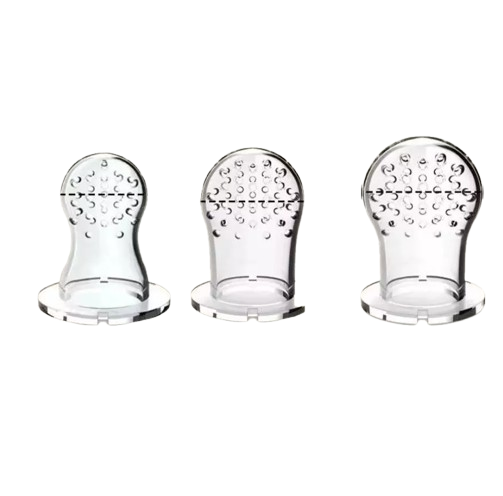 Fabriquée à partir de silicone alimentaire sans BPA et de polypropylène (PP), cette grignoteuse garantit une utilisation sans danger pour bébé. Le silicone souple est idéal pour les gencives sensibles, notamment en période de poussées dentaires. Elle est livrée avec trois embouts interchangeables pour s’adapter à l’âge de votre enfant :