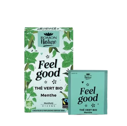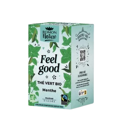 Thé Vert Menthe Bio est proposé dans une boîte carton recyclable, conçue pour marier plaisir des sens et conscience écologique.Les enveloppes protectrices, en papier extrudé et polyéthylène recyclables, conservent parfaitement la fraîcheur des feuilles et de l’extrait de menthe.