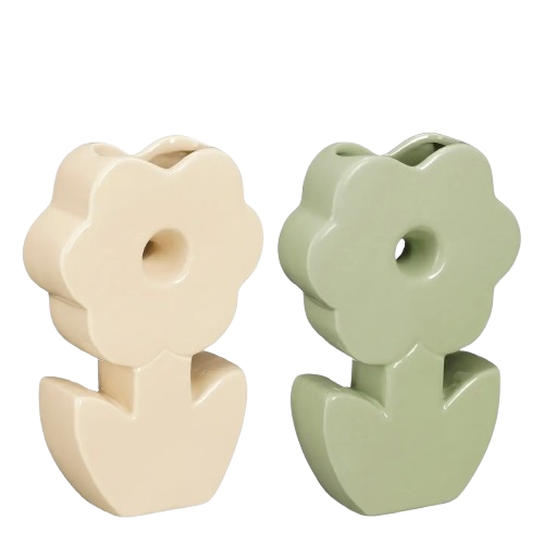 Craquez pour ces vases en forme de fleur stylisée, à la fois ludiques et minimalistes. Déclinés en vert sauge doux et jaune crème clair, ils apportent une touche printanière et rétro à votre intérieur, même sans bouquet !
